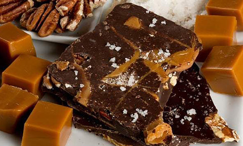 Luscious Chocolate embedded with sweet swirls of Caramel, generously covered with roasted Pecans and sprinkled with Portuguese Sea Salt. Turtle lovers will swoon with delight! One of our most enduringly popular barks! Also available in Milk or Dark Chocolate.
